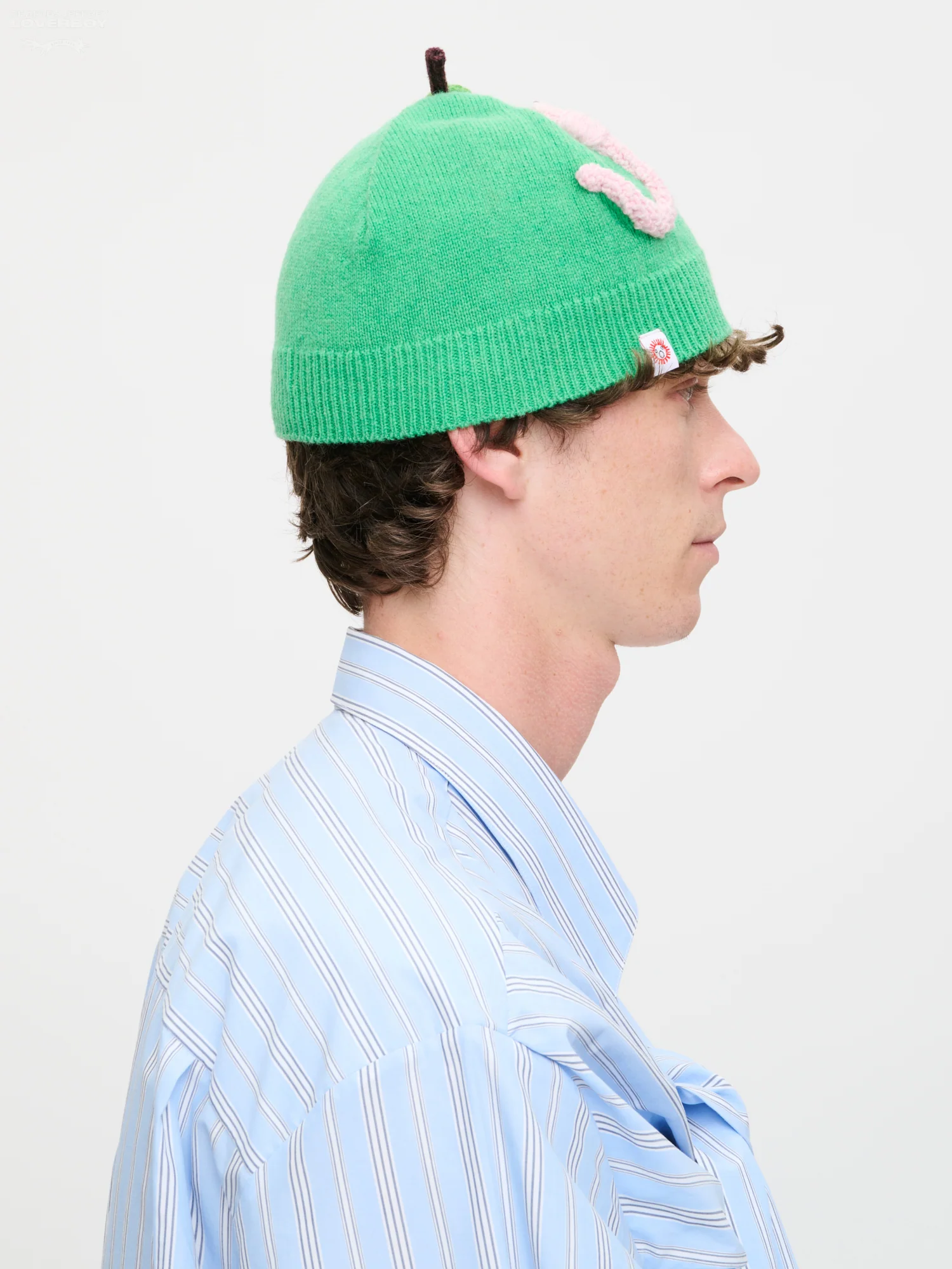 Pick an apple: our lightweight, lambswool-blend apple hat has the added bonus of a little pet worm peeping out of the side. Hi!