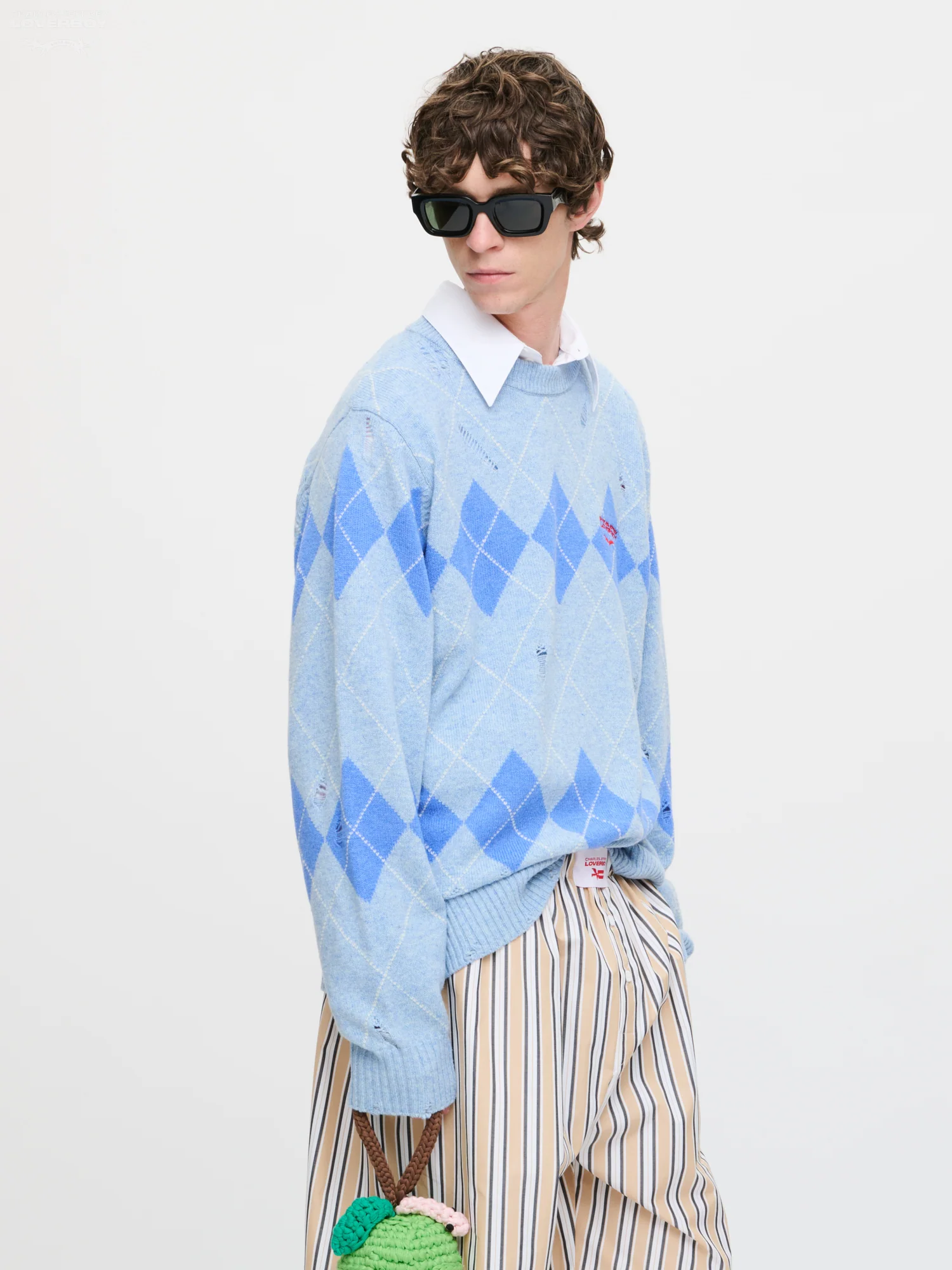 Just like LOVERBOY, an argyle knit is a Scottish classic. Our version is crafted from a sky blue lambswool blend with cerulean diamonds and white accents, and it's lightly distressed, creating a feeling of faded grandeur and a punkish edge. It's finished with bright red embroidered branding at the chest.