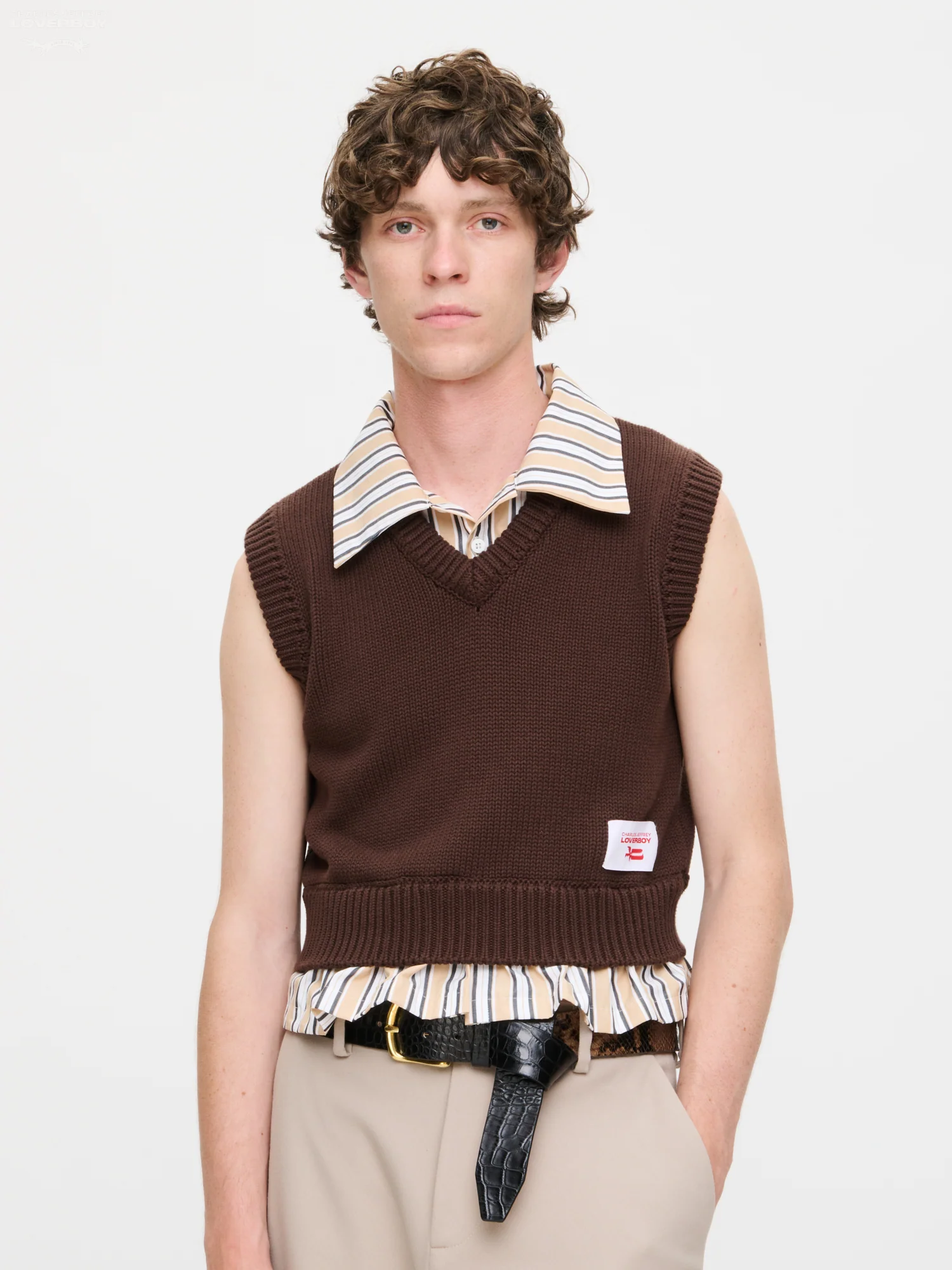 Yes, you're right, it is a sexy sweater vest - because ripping up the rulebook on vintage workwear is a vibe. A chunky, slightly cropped brown knit with a deep V-neck meets an inbuilt sleeveless shirt with a bold, retro stripe.